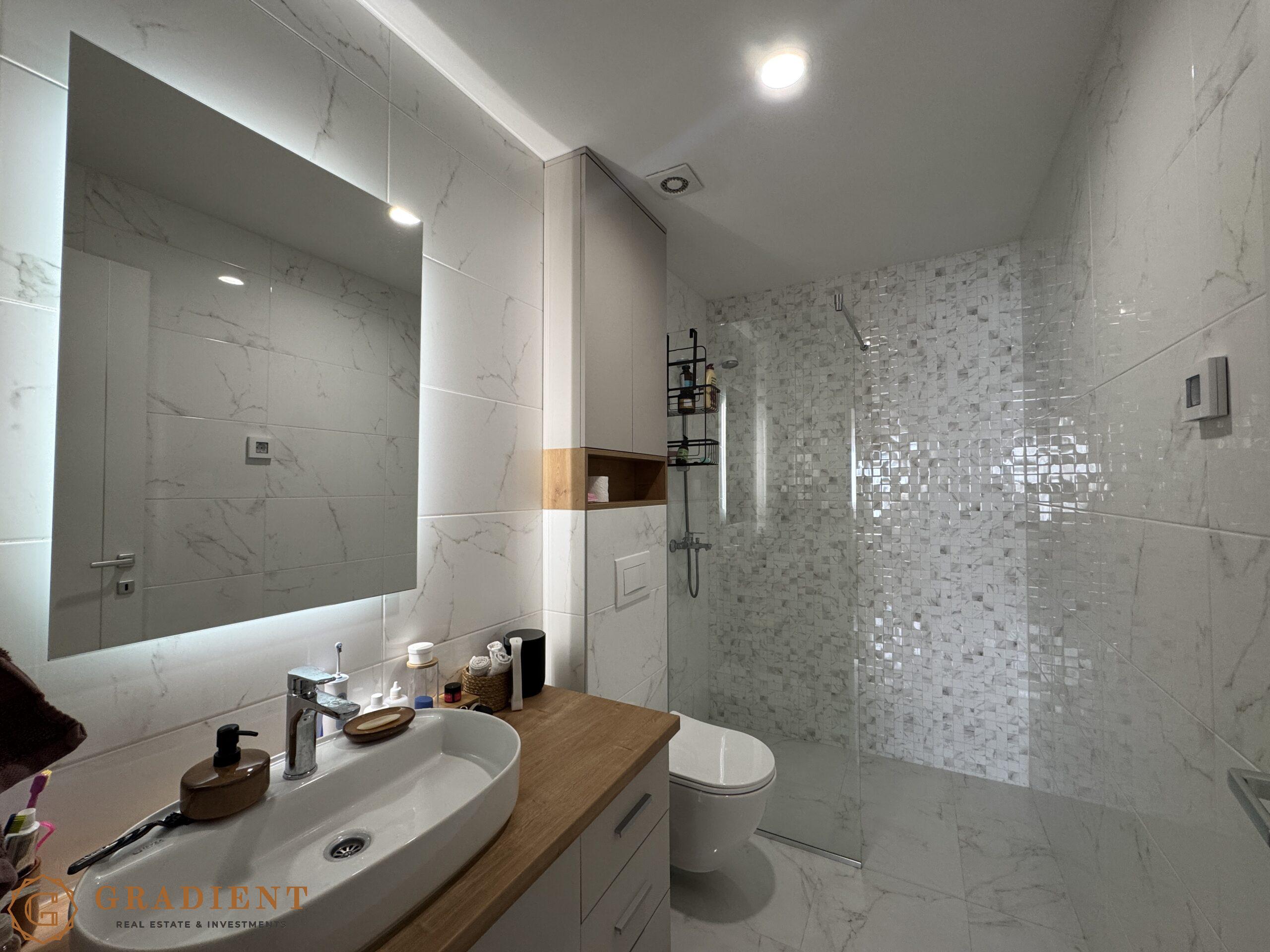 Kuhinja i kupatila opremljeni su vrhunskim materijalima i keramikom, dok su tehnički uređaji renomiranih proizvođača poput Bosch-a i Samsung-a, garant pouzdanosti i dugotrajnosti. Stan je opremljen multisplit sistemom klimatizacije sa tri unutrašnje jedinice, koji obezbjeđuje optimalnu temperaturu u svim prostorijama tokom cijele godine. Na raspolaganju je veliko kupatilo i WC sa praktičnim vešerajem, diskretno uklopljenim u prostor.